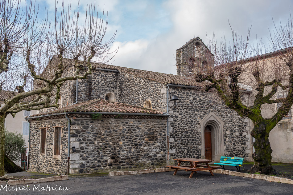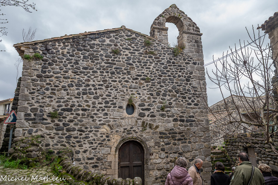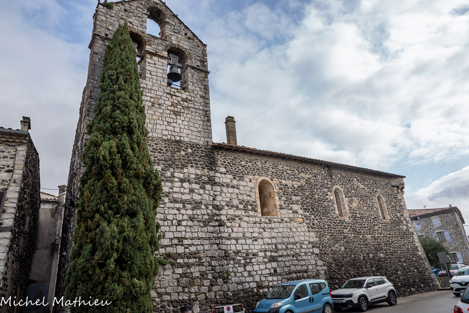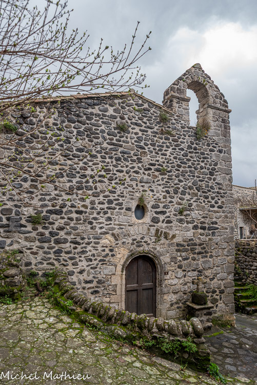 Le clocher mur à 3 ouvertures de l'église saint André. Après l'abandon de la cité romaine, il faut attendre le Moyen-Âge pour trouver mention d'une nouvelle agglomération à l'emplacement du village actuel. Au XIe ou XIIe siècle, un donjon, puis un château fort, furent édifiés sur le neck qui porte le château actuel. Des maisons commencèrent à se grouper à son pied, amorce d'un village castral.