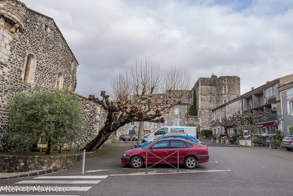Place du château. A partir de 1567-1571 les guerres de religion ont d’importantes conséquences sur la vie d’Aps : les églises paroissiales St Pierre et St Martin, construites hors remparts, sont détruites. En 1620 on contruit l’église St André dans le village.