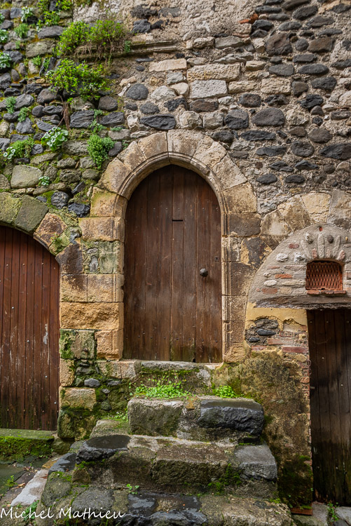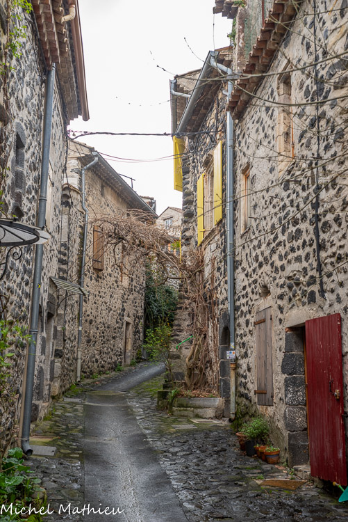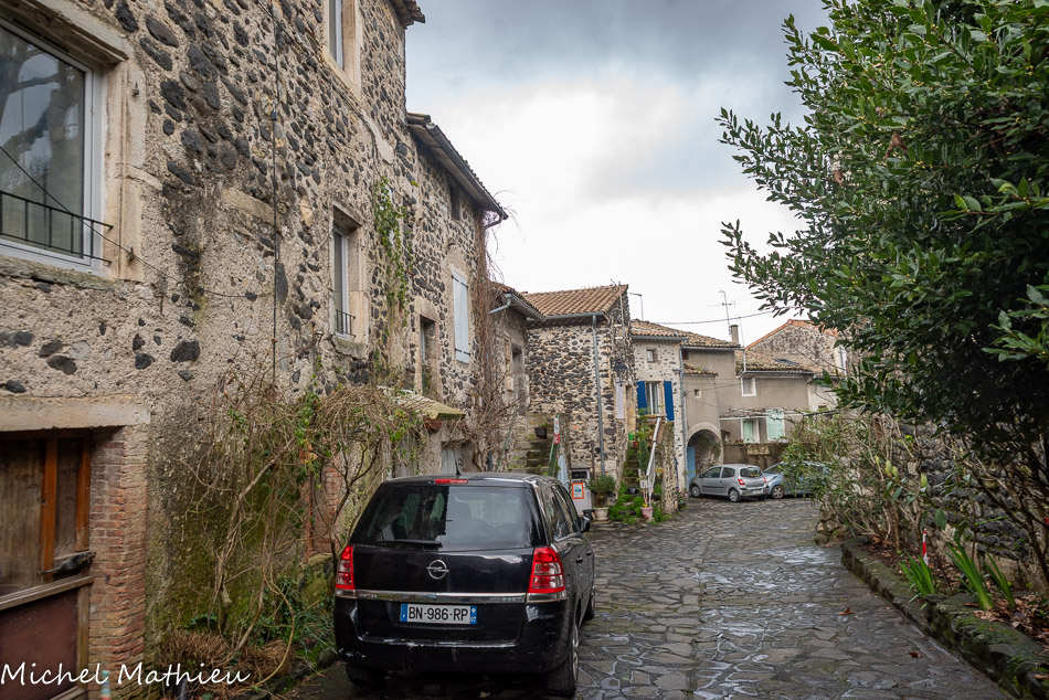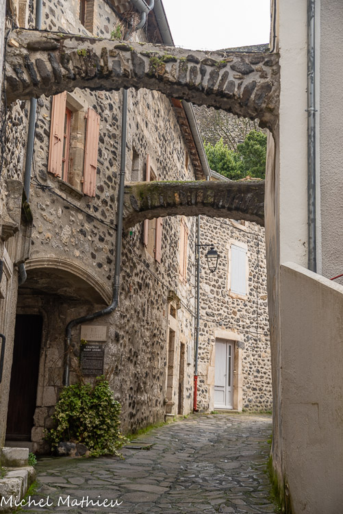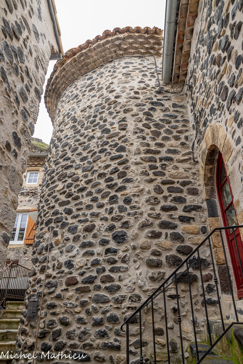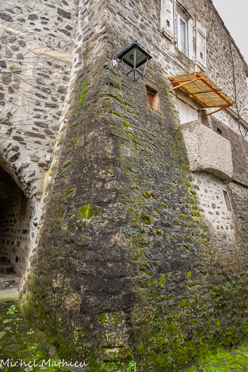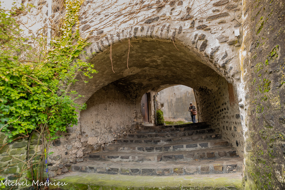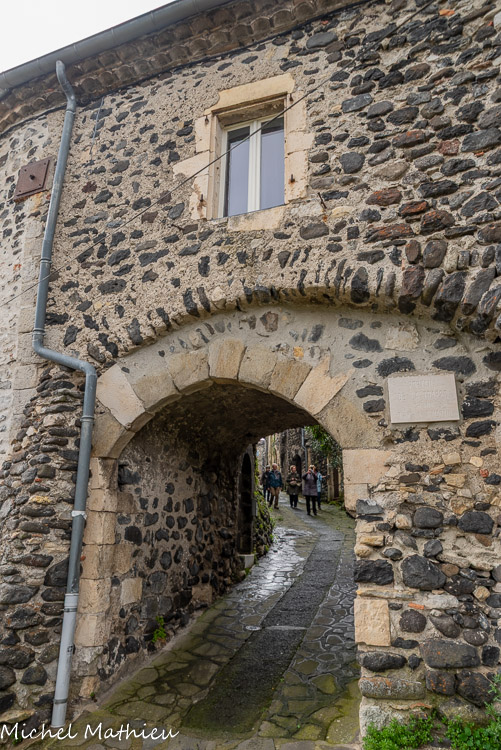 Rue du Four. Le bourg médiéval s’est construit en arc de cercle autour du château érigé sur un neck volcanique. Il se parcourt par un réseau de ruelles dallées.