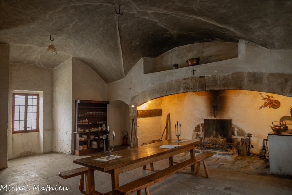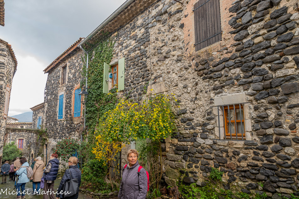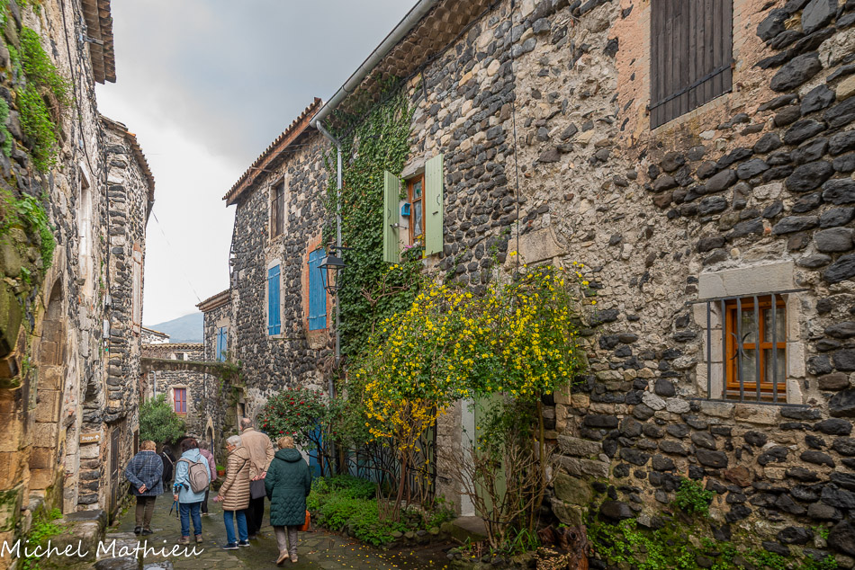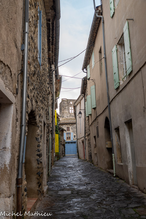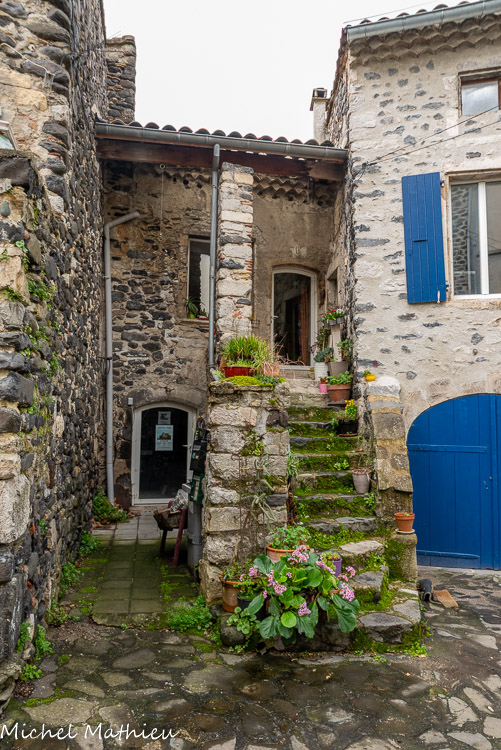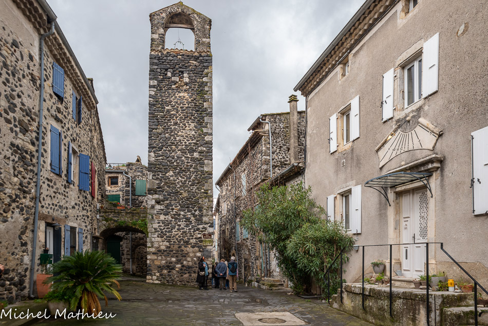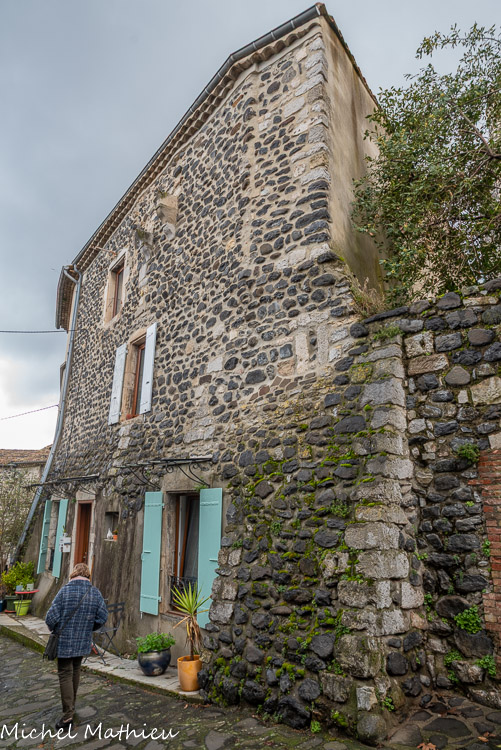 Rue du Four. Le bourg médiéval s’est construit en arc de cercle autour du château érigé sur un neck volcanique. Il se parcourt par un réseau de ruelles dallées.