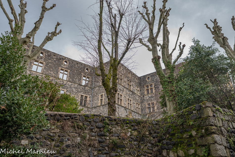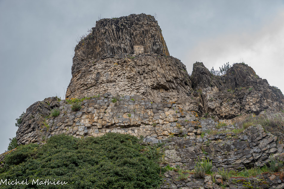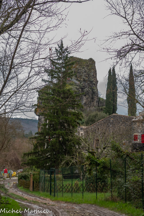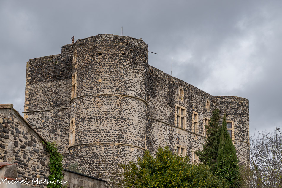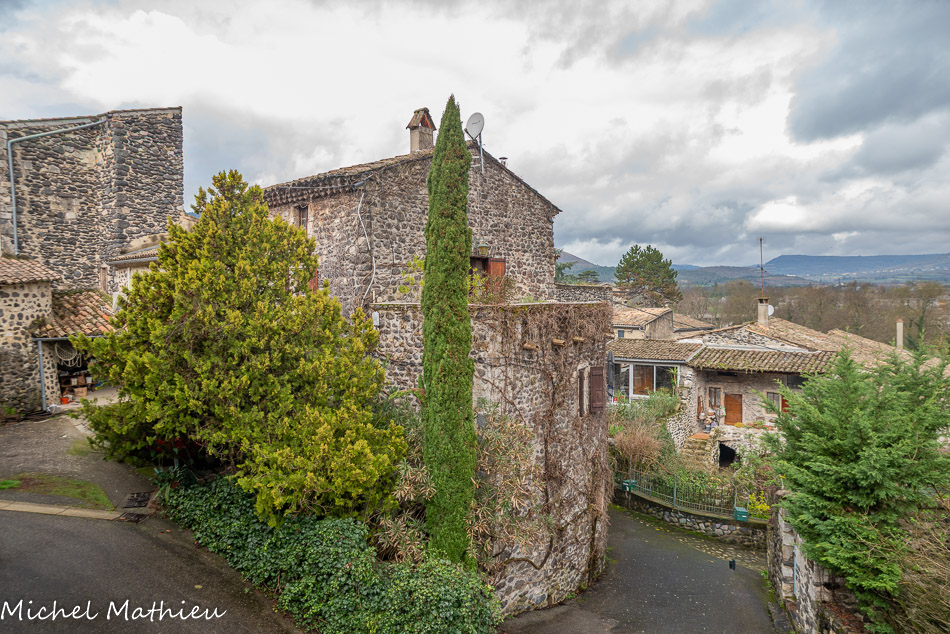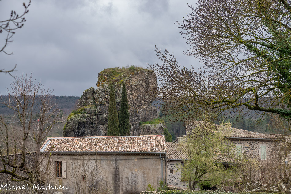 Au fond, le Coiron d'où provient le basalte qui a servi à la construction des bâtiments. Le massif du Coiron est l’exemple d’un phénomène géologique appelé « inversion de relief ». Il y a 6 à 8 millions d’années, a lieu une intense activité