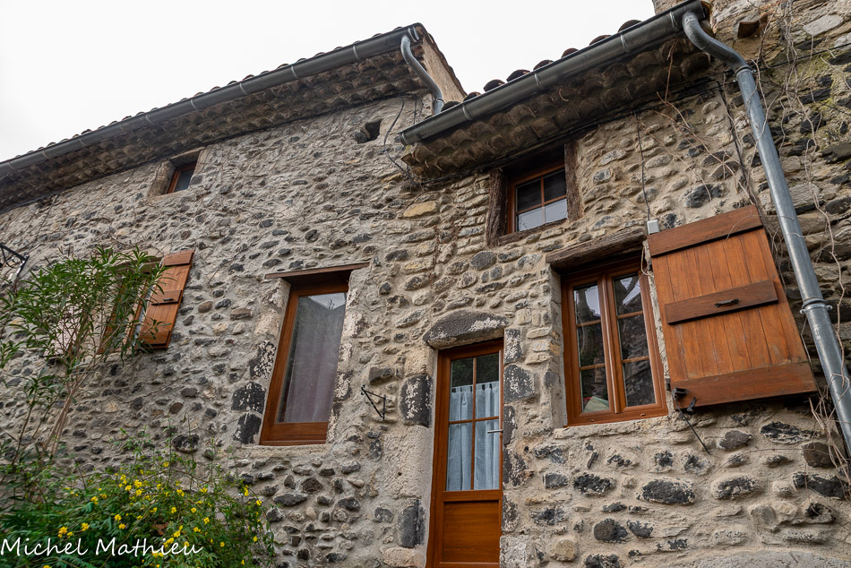 Rue du Four. La particularité d’Aps et de La Roche c’est son architecture mêlant le basalte, pierre noire d’origine volcanique, et le calcaire, pierre blanche, dont une partie est récupéré sur les ruines de l’ancienne cité antique d’Alba. Ces pierres calcaires déjà taillées étant utilisées le plus souvent pour l’encadrement des portes et des fenêtres, pour la construction des escaliers, alors que le basalte plus difficile à tailler constituait en grande partie les murs.