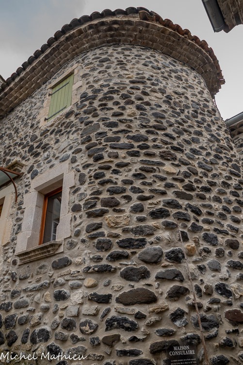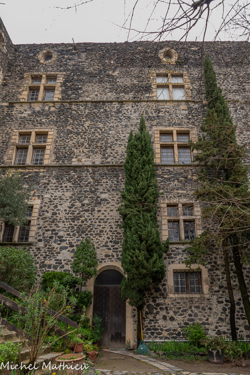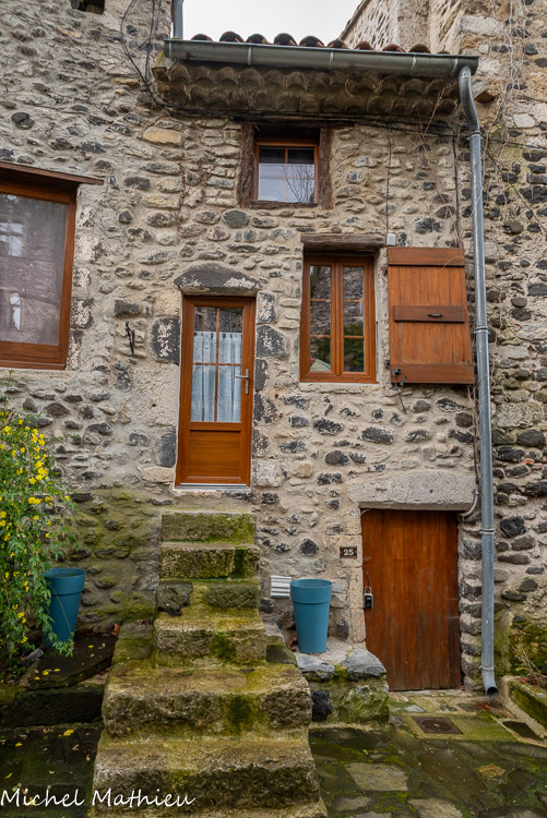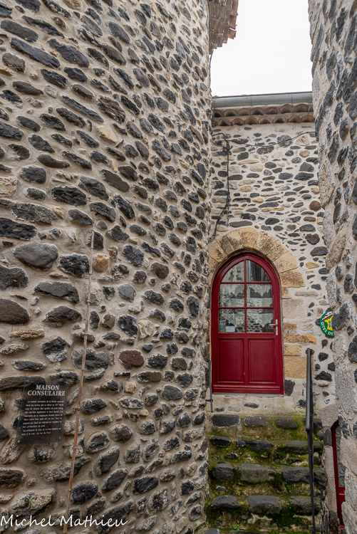 Rue du Four. Maison typique qui correspond à une parcelle. Ele est en pierres de basalte. Les linteaux sont en calcaire. L’ensemble des maisons visibles actuellement datent pour la plupart du XVIème-XVIIème s. à quelques exceptions près (maisons du XIVe et XVe s.). L’architecture reste similaire pour l’ensemble des constructions : un comble (grenier) sous les toits, une pièce à l’étage qui sert de logement et à laquelle on accède par un escalier intérieur ou extérieur comme ici et une pièce voûtée au rez-de-chaussée appelée « la crotte » qui sert de boutique, d’atelier, de cave ou d’étable d’où son nom. L'escalier était à l'extérieur pour gagner de l'espace à l'intérieur.