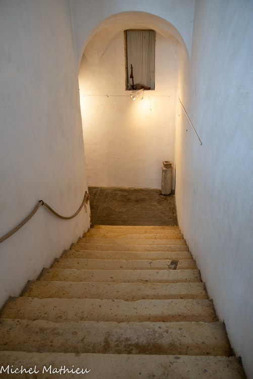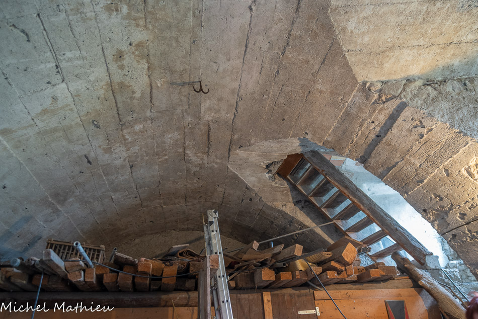 Eglise saint André. Cette échauguette a été tronquée à la suite de la réfection de la toiture. Les maîtres d’œuvre, maçons du pays, avaient reçus l’autorisation de prélever des pierres en calcaire taillé, dans les ruines autour de St Pierre. Ils les ont remployées en parement sur toute une partie de la façade méridionale et dans le clocher.
