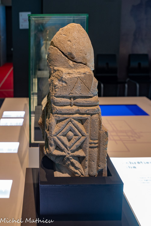 Milieu 5ème—6ème siècle après JC. Qartier Saint-Pierre, Alba-la-Romaine. Dans l'architecture ecclésiastique, le chancel (du latin cancelli, « barrière », balustrade ») est une clôture qui sépare la nef où sont réunis les fidèles, du c chœur liturgique réservé au clergé. Son origine remonte à l’Antiquité : dans les lieux publics, le chancel était une barrière qui séparait les orateurs magistrats du peuple, ayant notamment pour fonction de prévenir les débordements du public. Ce pilier est un élément de cette barrière. Dans les rainures se glissaient les plaques de ‘ensemble auquel l appartenait. Des décors géométriques sont caractéristiques de l’art wisigothique.