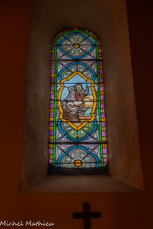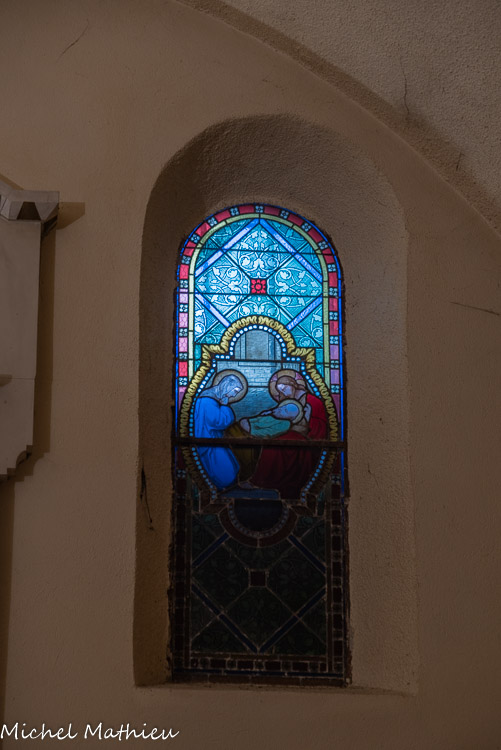 Mort de Charles de Foucauld (?), ordonné prêtre à Viviers en 1901 et mort en 1916 à Tamanraset. Vitrail de l'Atelier Thomas, Valence, 1923