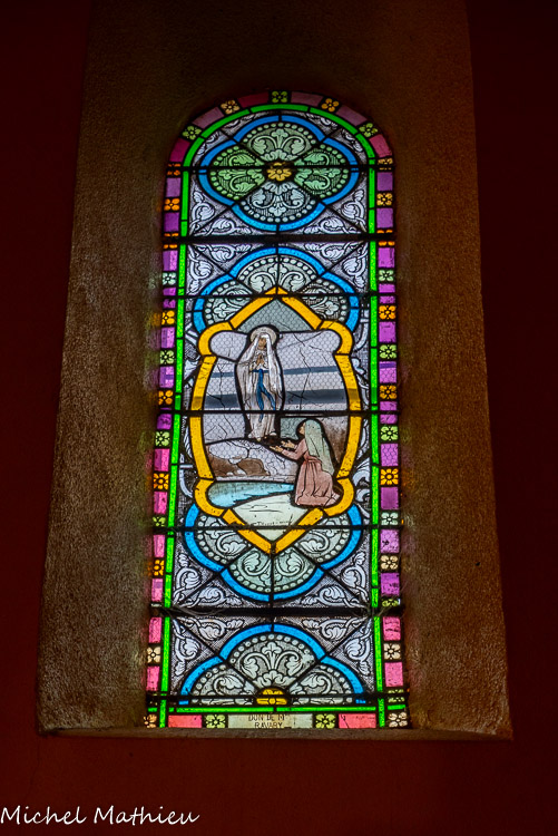 La Vierge apparaissant à Bernadette Soubirous en 1858. Vitrail de l'Atelier Thomas, Valence, 1923.