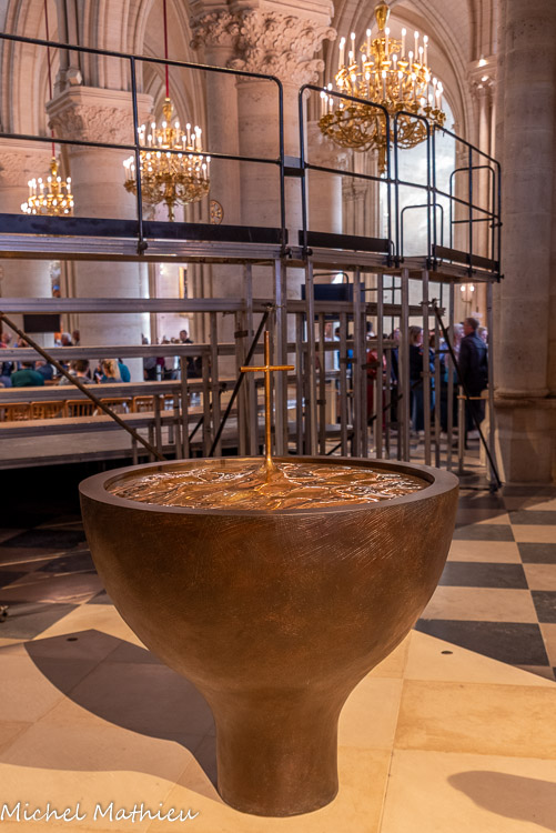 En entrant à nouveau dans Notre-Dame de Paris, par le portail central de la façade occidentale, celui du Jugement dernier, la première étape n’est autre que le baptistère. Conçu par le sculpteur Guillaume Bardet à la demande du diocèse de Paris, il remplace le baptistère mobile utilisé avant l’incendie. Désormais, dès son arrivée, chacun pourra admirer une croix d’or jaillissant des flots du même métal et contenus dans une simple vasque en bronze. Une matière utilisée pour les cinq éléments du mobilier liturgique commandé au même artiste.s.