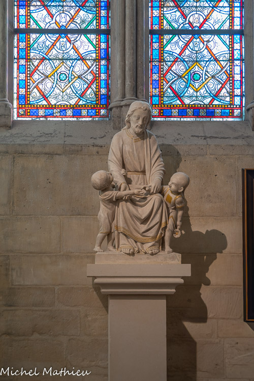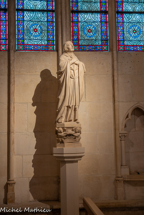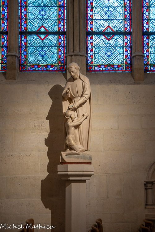 En saint Vincent de Paul, l'Esprit de Service donne de suivre Jésus qui vient en aide à tous ceux qu'il aime. Statue de saint Vincent de Paul. Geoffroy-Dechaume, sculpteur, vers 1864. Vitrail en grisaille. Alfred Gérente, maître-verrier, 1865