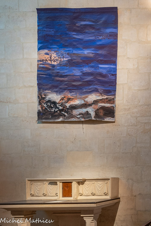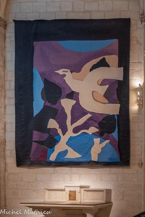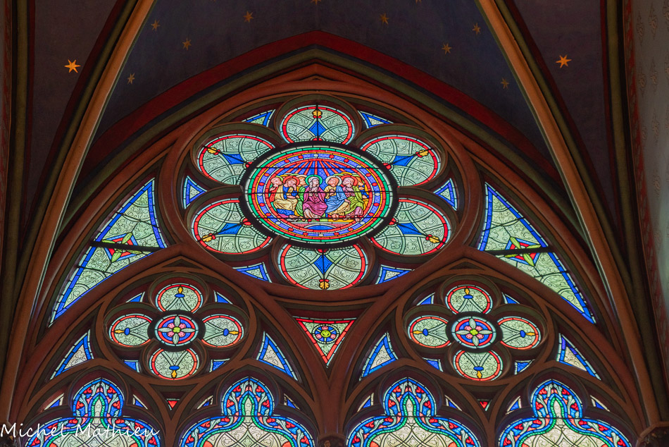 Vitraux du choeur. A gauche , l'Annonciation. Au centre, la Glorification de la Vierge, à droite, la Visitation.