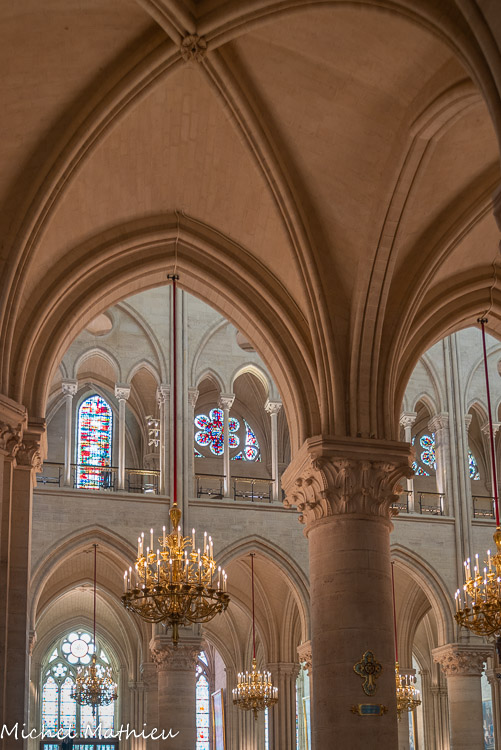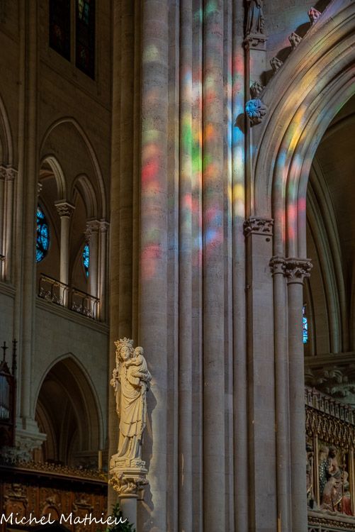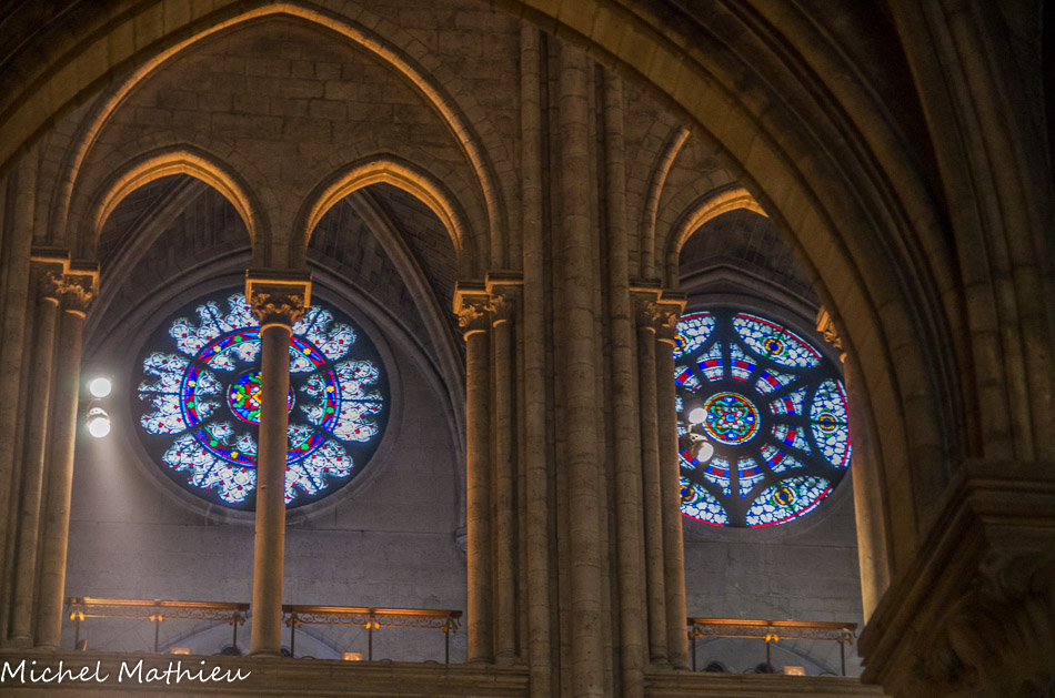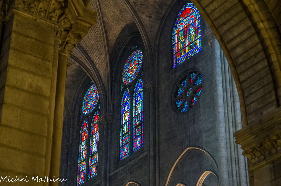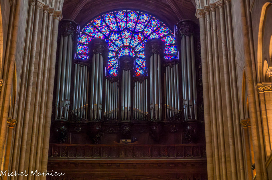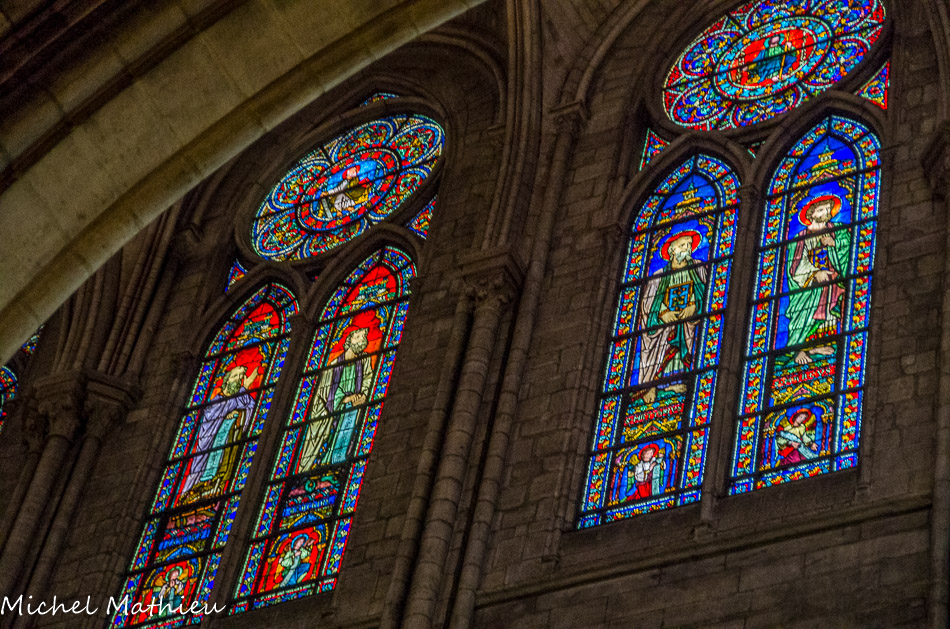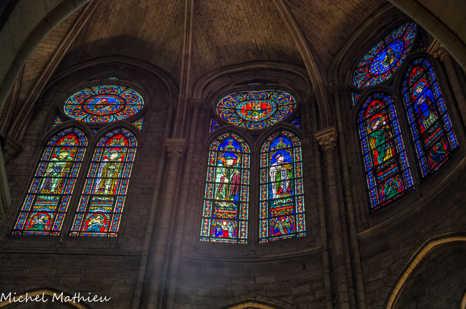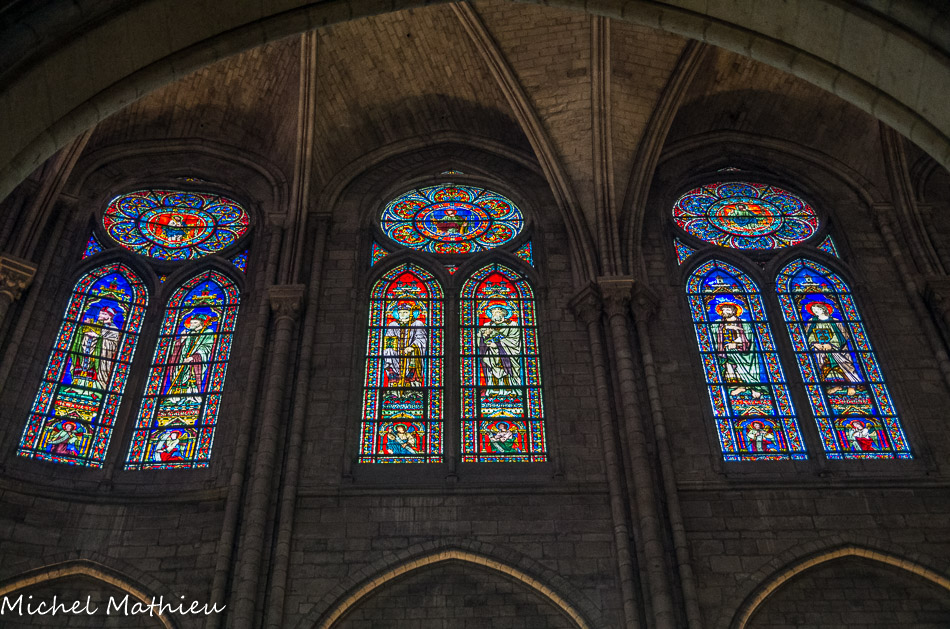 En 1965, les fenêtres hautes de la nef et les roses des tribunes ont enfin été garnies de vitraux colorés remplaçant les verres gris et ternes implantés par les chanoines au XVIIIe siècle. Non figuratifs, ils sont l’œuvre de Jacques Le Chevallier qui a utilisé les produits et couleurs du Moyen Âge. L’ensemble est à dominante rouge et bleue.