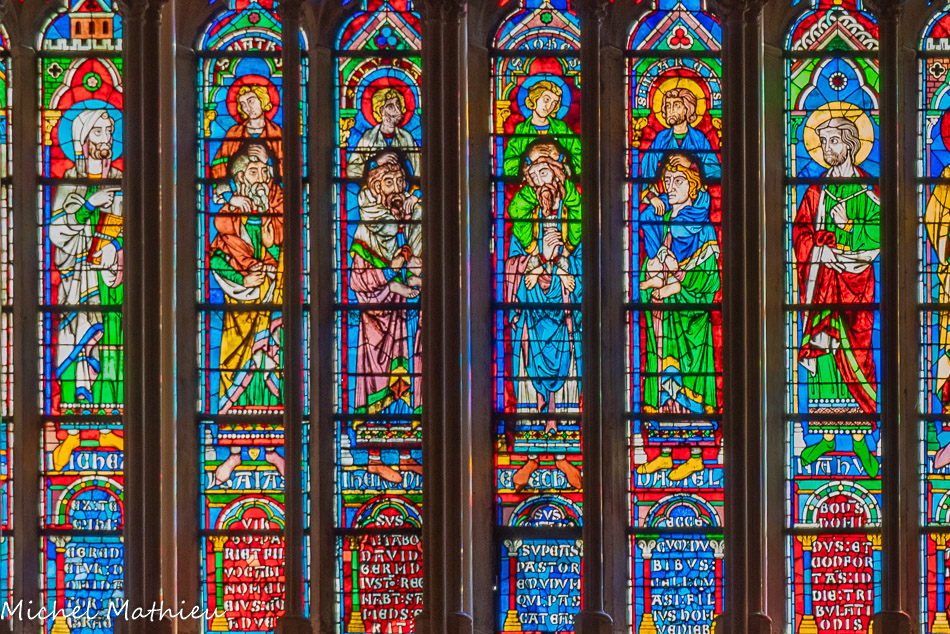 Vue d’ensemble des vitraux de Laurent Charles Maréchal dans les fenêtres hautes du chœur.