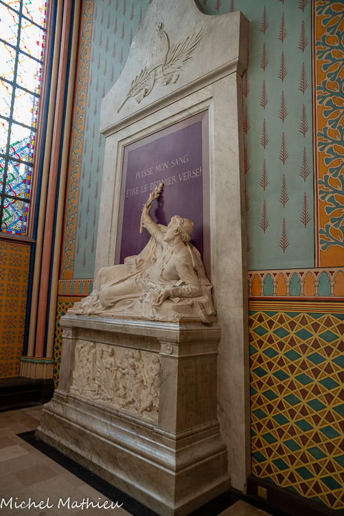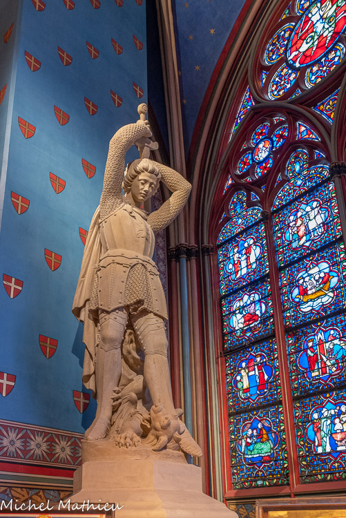 En sainte Geneviève, l'Esprit de Force donne de rétablir la justice et le droit quand ils sont bafoués. Statue de sainte Geneviève. Victor Geoffroy-Dechaume, sculpteur, 1865. Vitrail en grisaille. Alfred Gérente, maître-verrier, 1865
