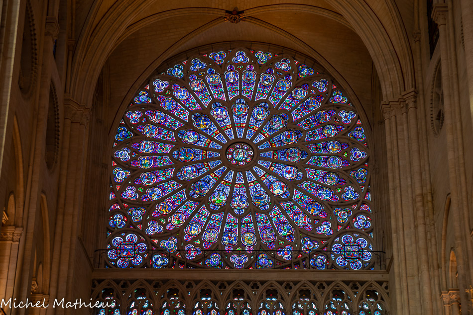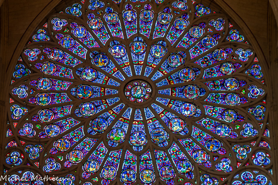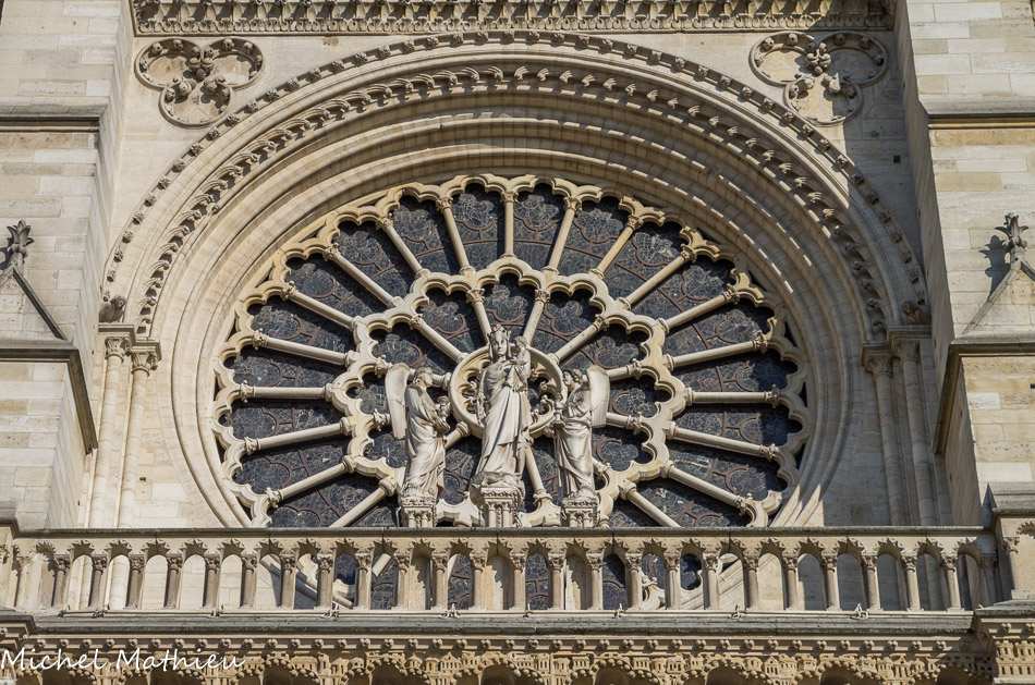 Au centre, une grande rose, dont le diamètre mesure presque 10 mètres, forme une auréole à la statue de la Vierge Marie qui est encadrée par deux anges et nous présente son enfant, Jésus, le Fils de Dieu.
