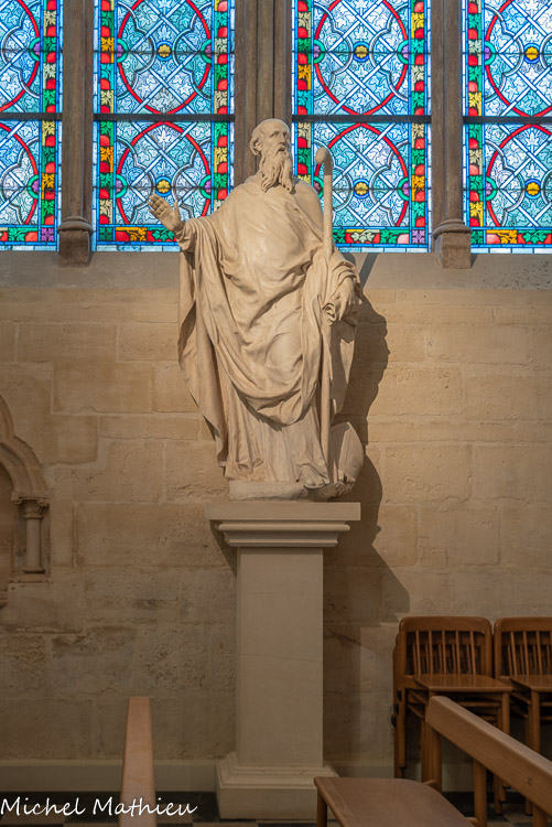 Statue de saint Pierre, apôtre et premier pape (+ 64). Claude Anthime Corbon, sculpteur, vers 1865. Vitrail en grisaille. Alfred Gérente, maître-verrier »1864..