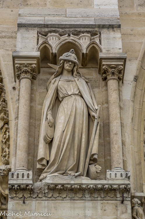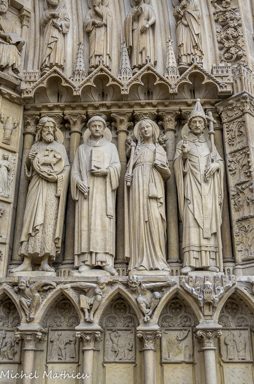 Sur cette façade, 28 statues représentent les rois de Juda et d’israël, ancêtres du Christ. Au-dessus de ces personnages, de part et d’autres de la façade, on trouve les statues d’Adam et Eve. Ces statues ont été refaites par Viollet-le-Duc au XIXe siècle.