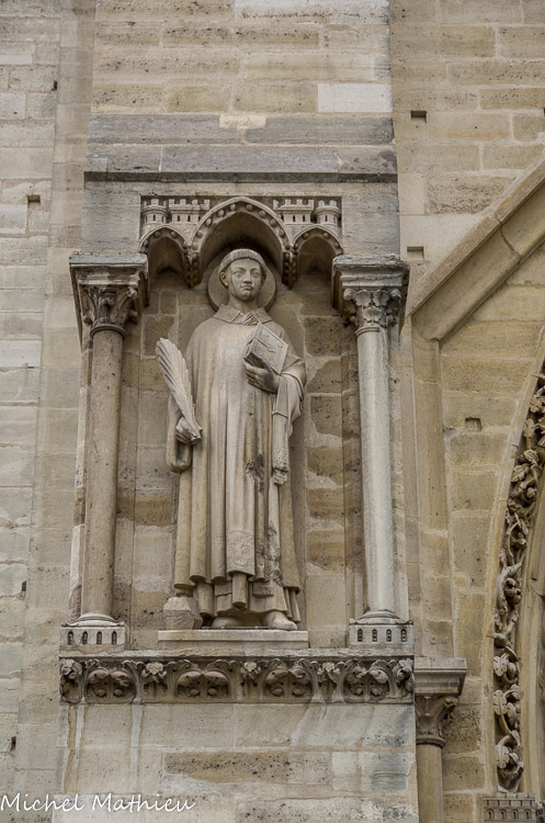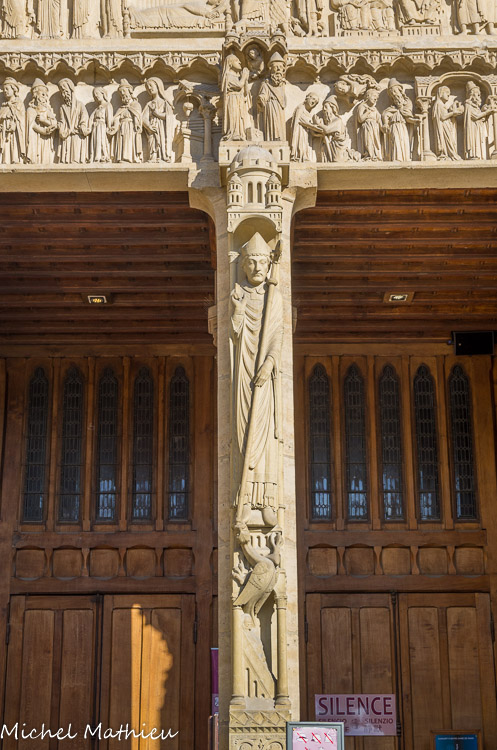 Au trumeau, Saint Marcel, évêque de Paris au Ve siècle, qui écrase un dragon symbolisant les fléaux dont son diocèse était alors affligé.