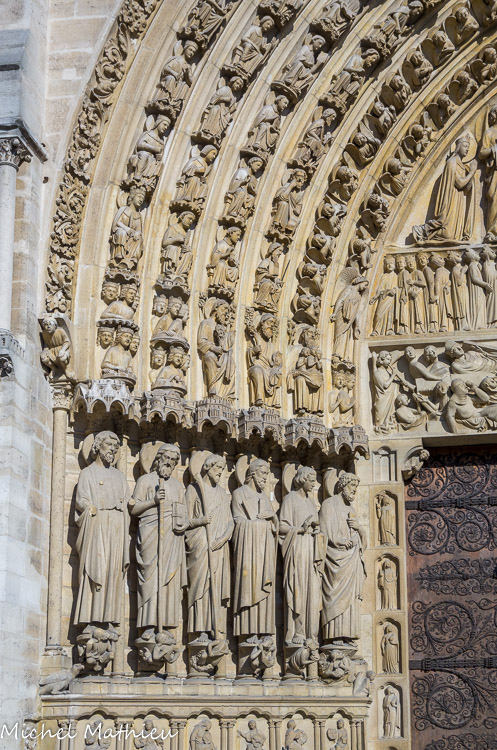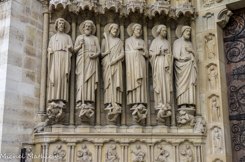 A droite, Paul, Jacques le Majeur, Thomas, Philippe, Jude et Matthieu. Aux piédroits sous les grandes statues, deux rangées de bas-reliefs représentent les Vertus et les Vices.