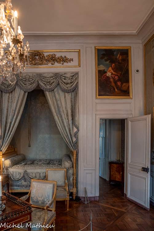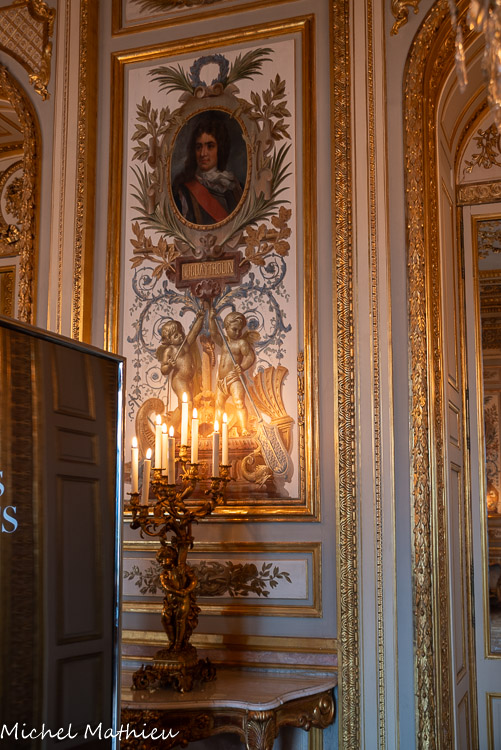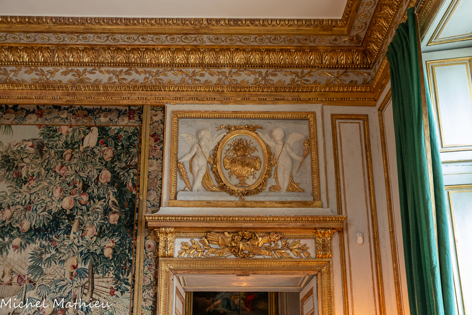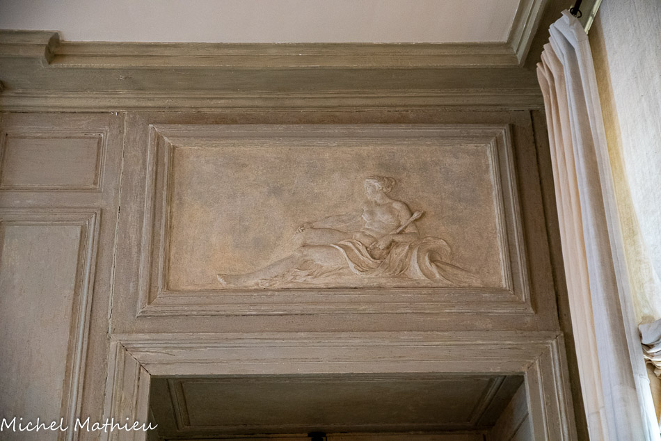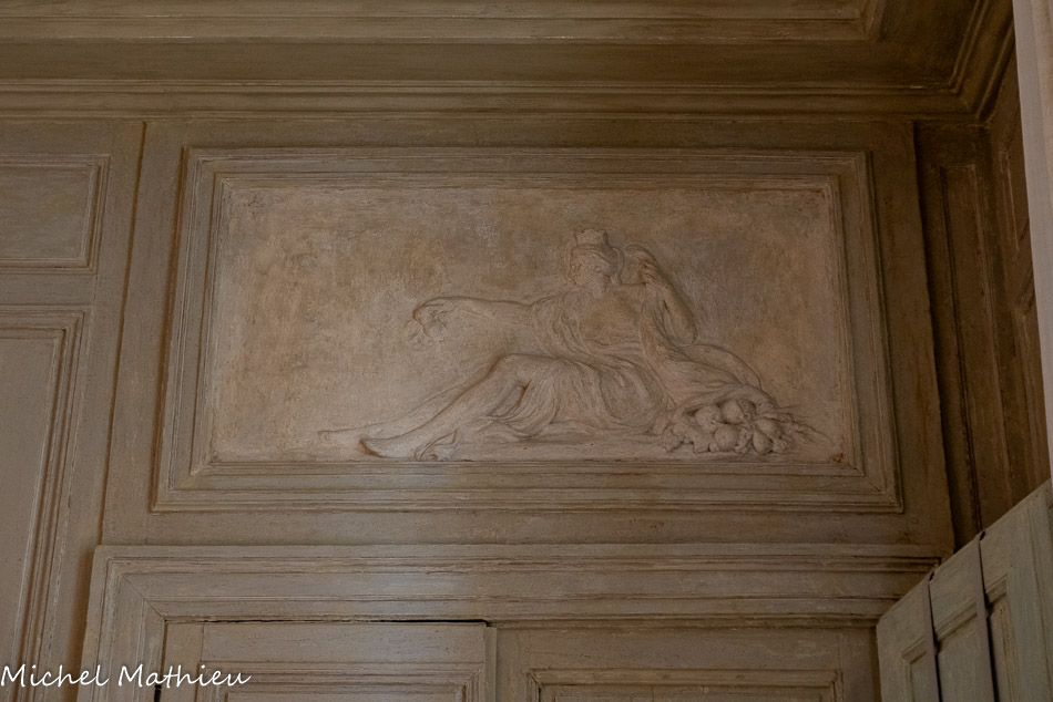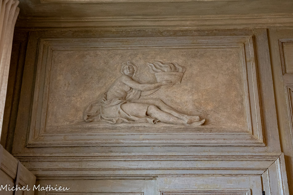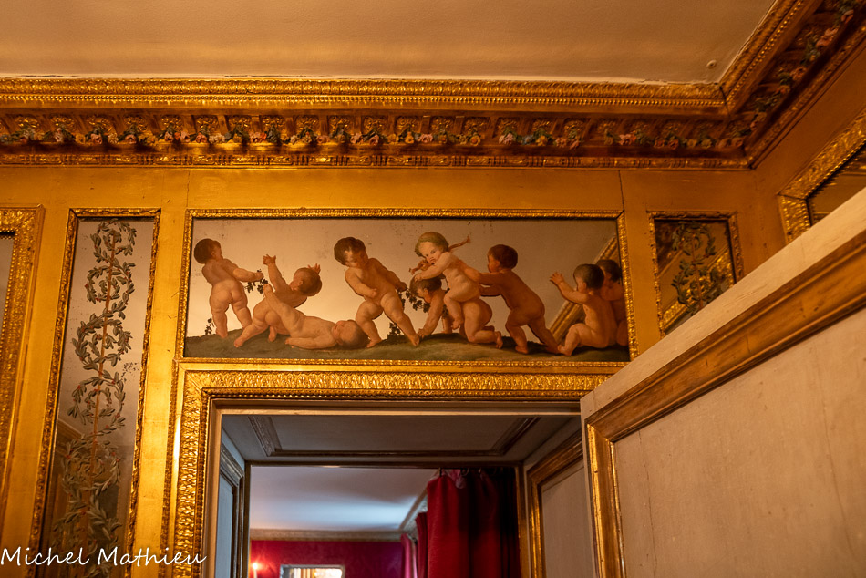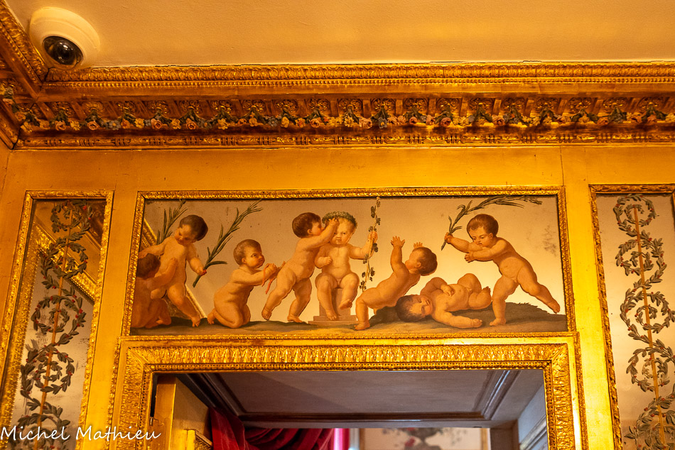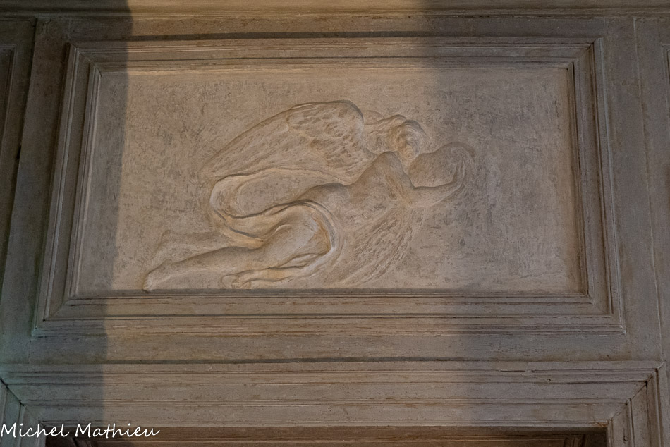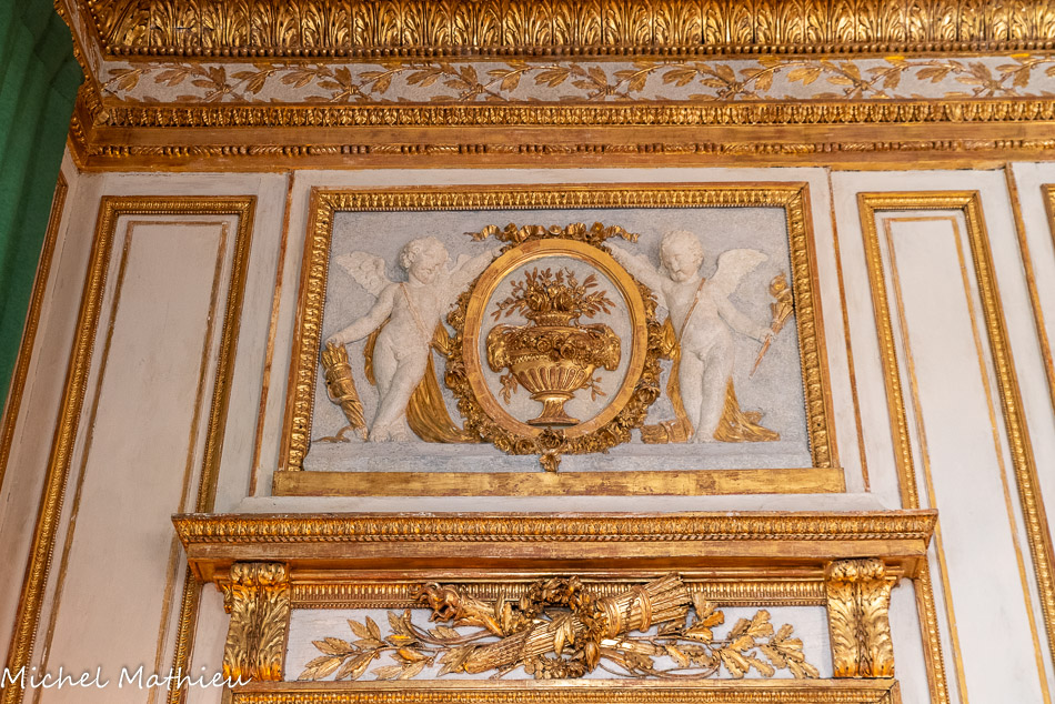Tableau : Saint François stigmatisé. 1650-1674. Dans un cadre en bois sculpté (palmettes, rangs de perles) et doré de format rectangulaire vertical, saint François est représenté dans un encadrement cintré au sommet, couché et le bras droit appuyé sur le sol, levant la main gauche et la tête en direction du ciel, vers deux chérubins apparaissant dans les nuées. Sur le sol est posé un crâne. Derrière lui, les troncs de deux arbres se croisent, subtile allusion à la croix." title="" />