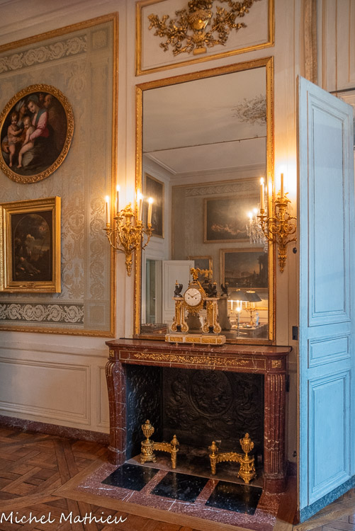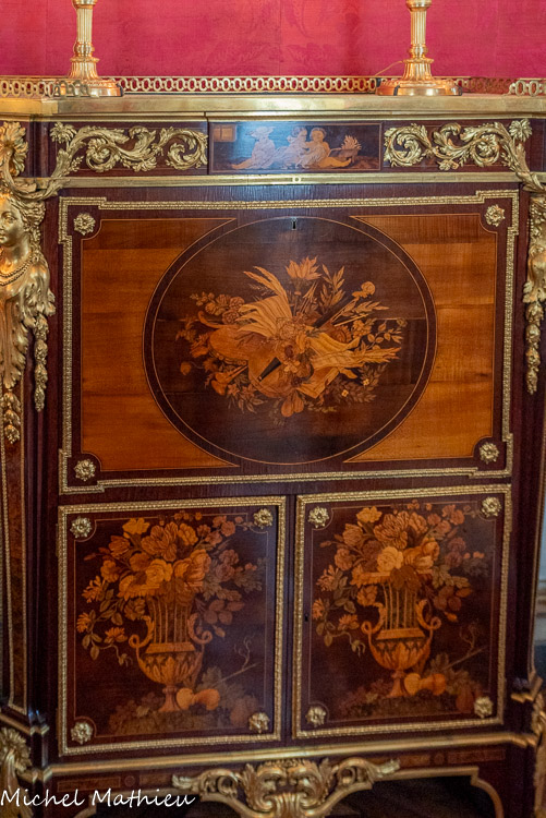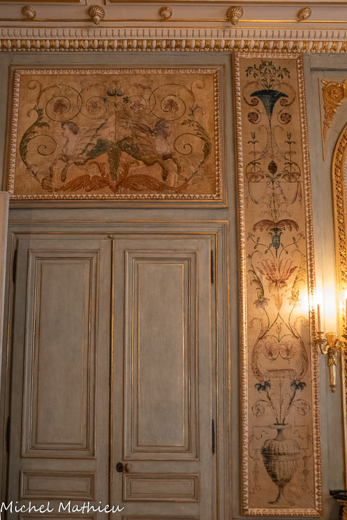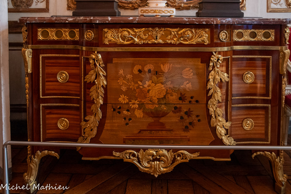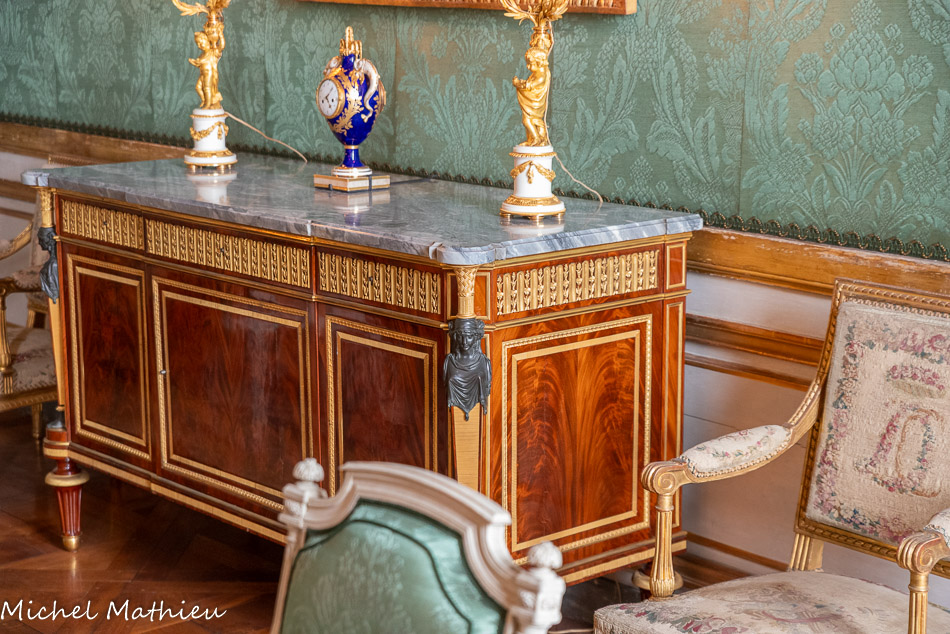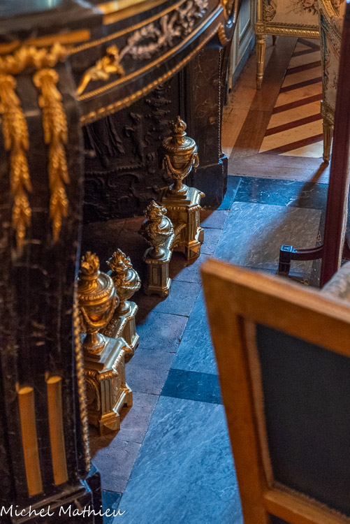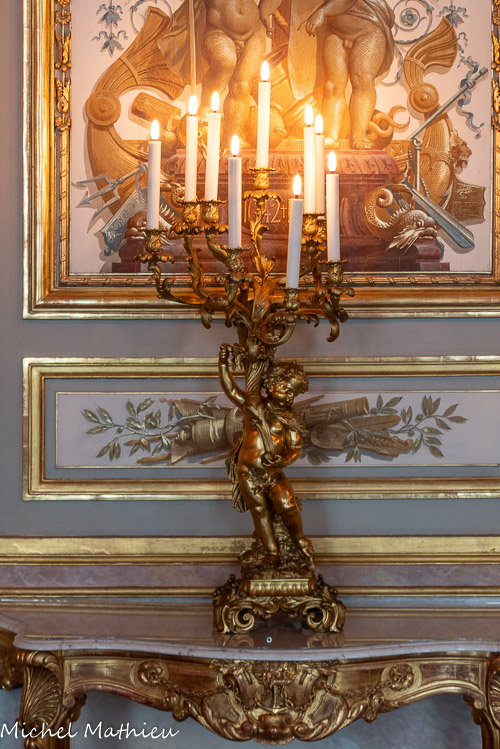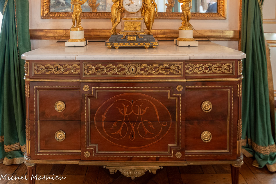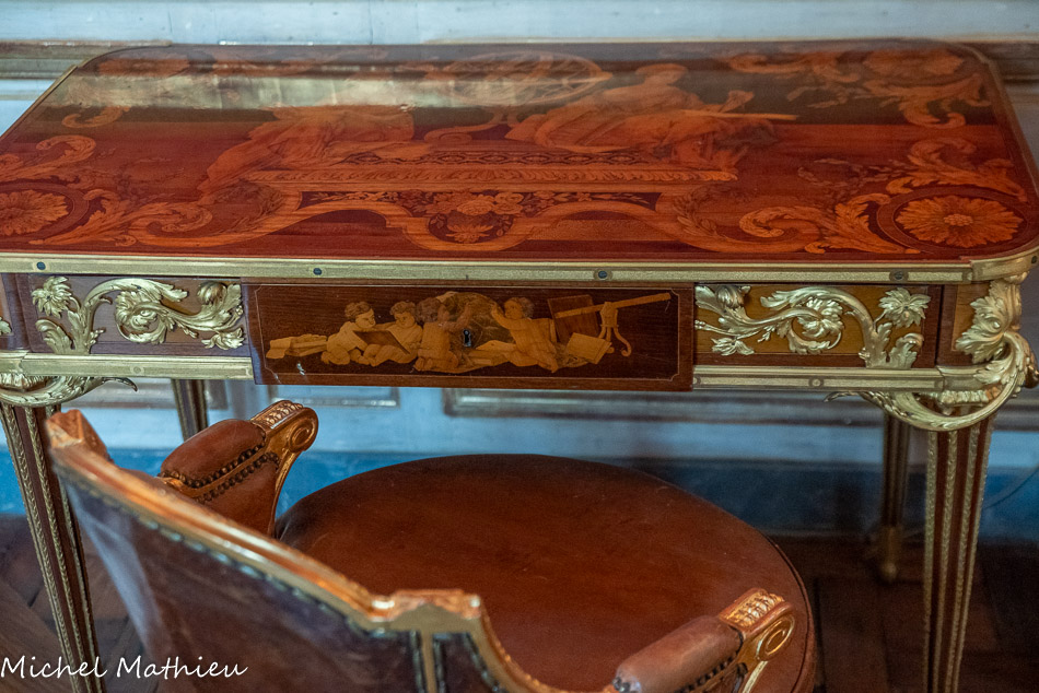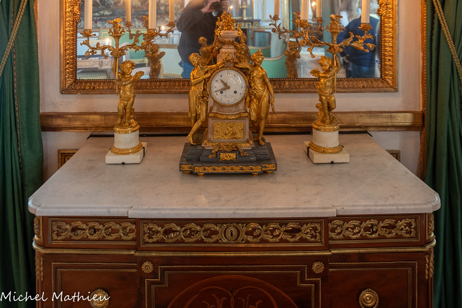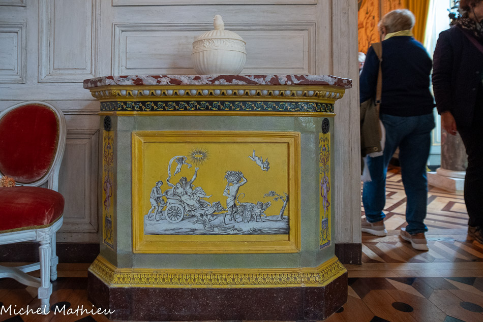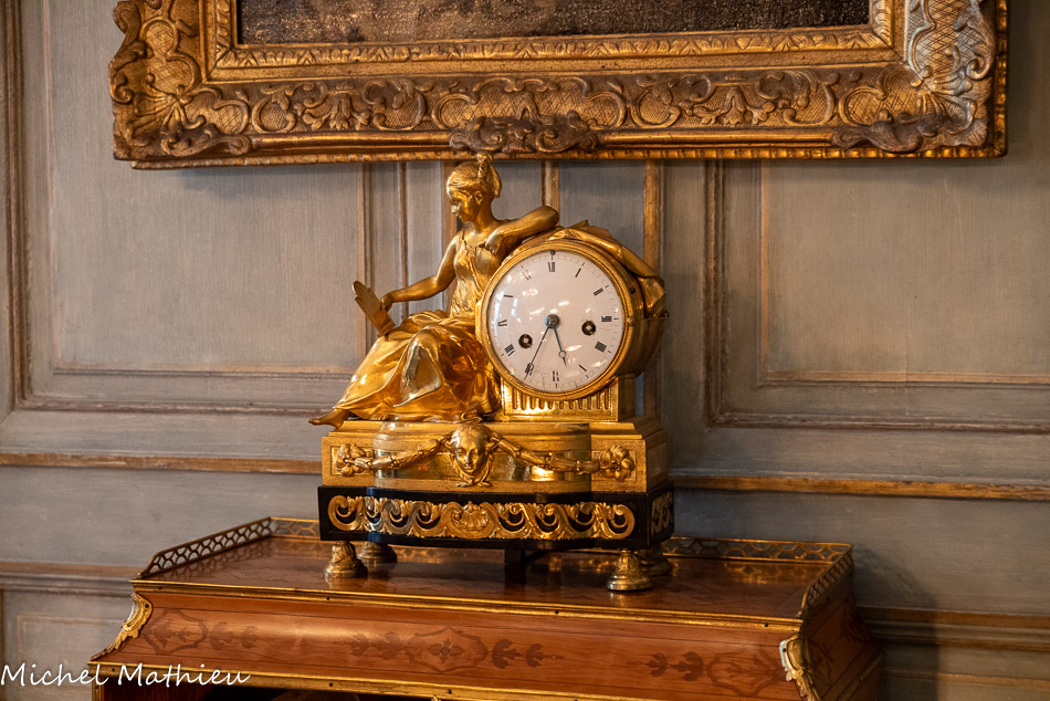 Pendule en porcelaine bleue en forme de lyre. Au centre de la lyre, le cadran émaillé est constitué des douze signes du zodiaque. Le mécanisme est doté de quatre aiguilles, les deux premières indiquant les heures et les secondes, les deux autres, qui manquent, indiquaient les jours et les mois. Un soleil rayonnant en bronze doré surmonte la lyre. Des guirlandes de fleurs et de fruits tombent en chutes, et un décor de couronne de lauriers entoure le cadran. Enfin, des rangs de perles ornent le pied.