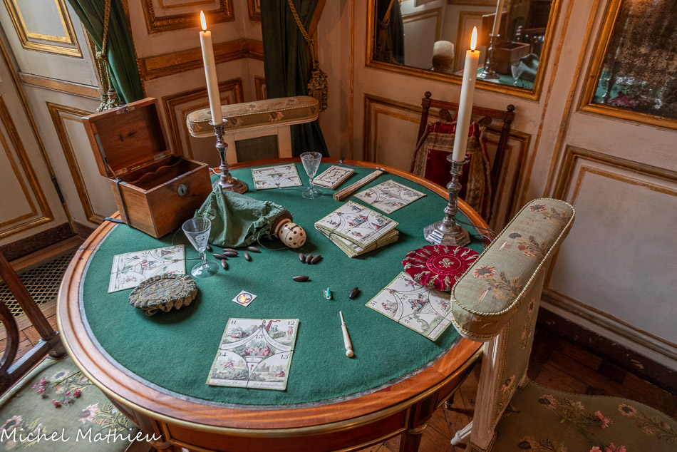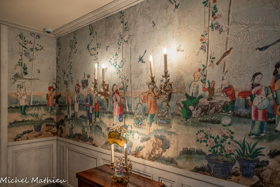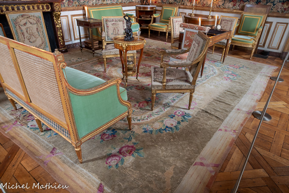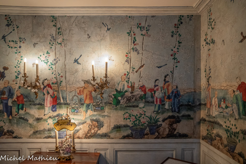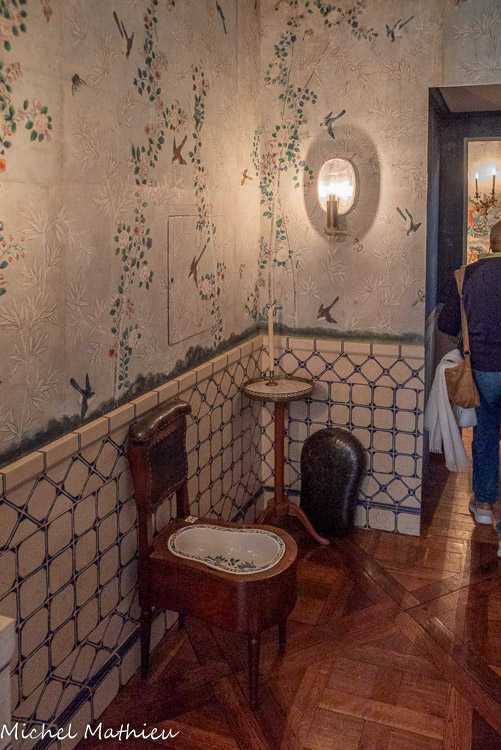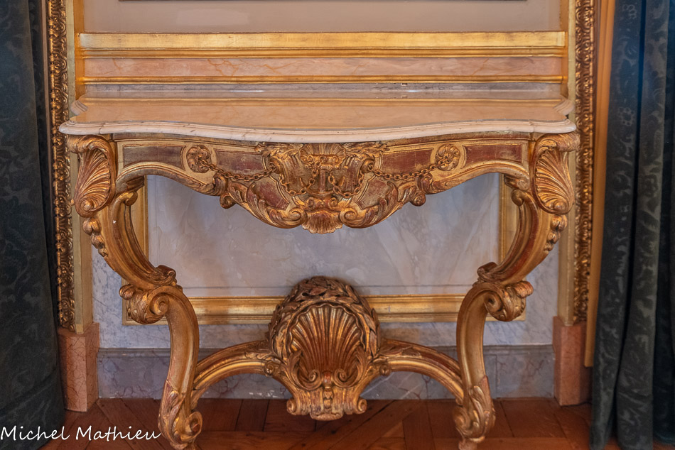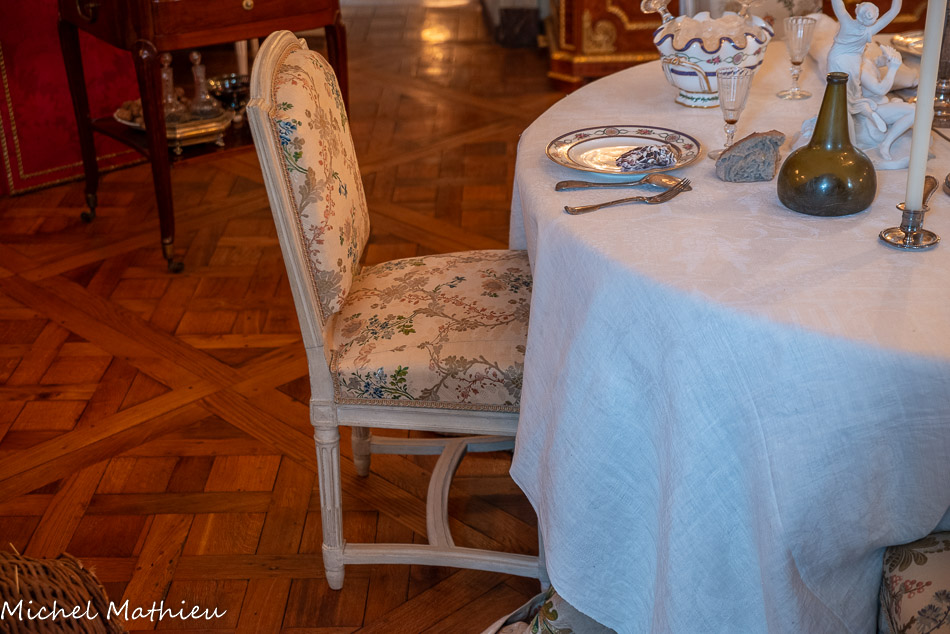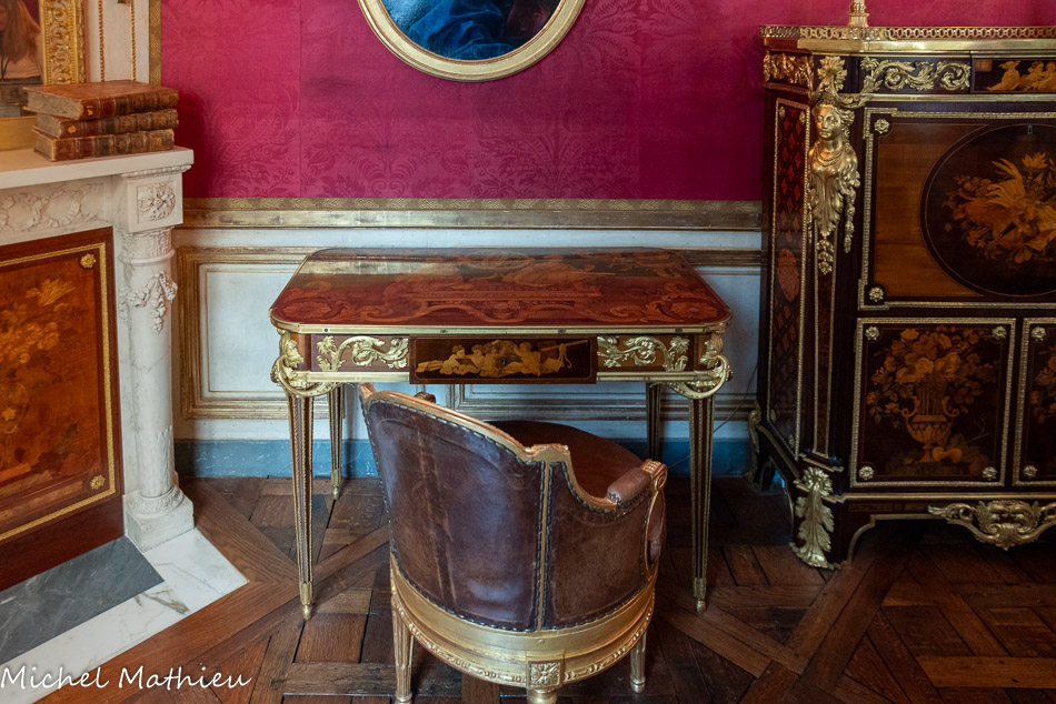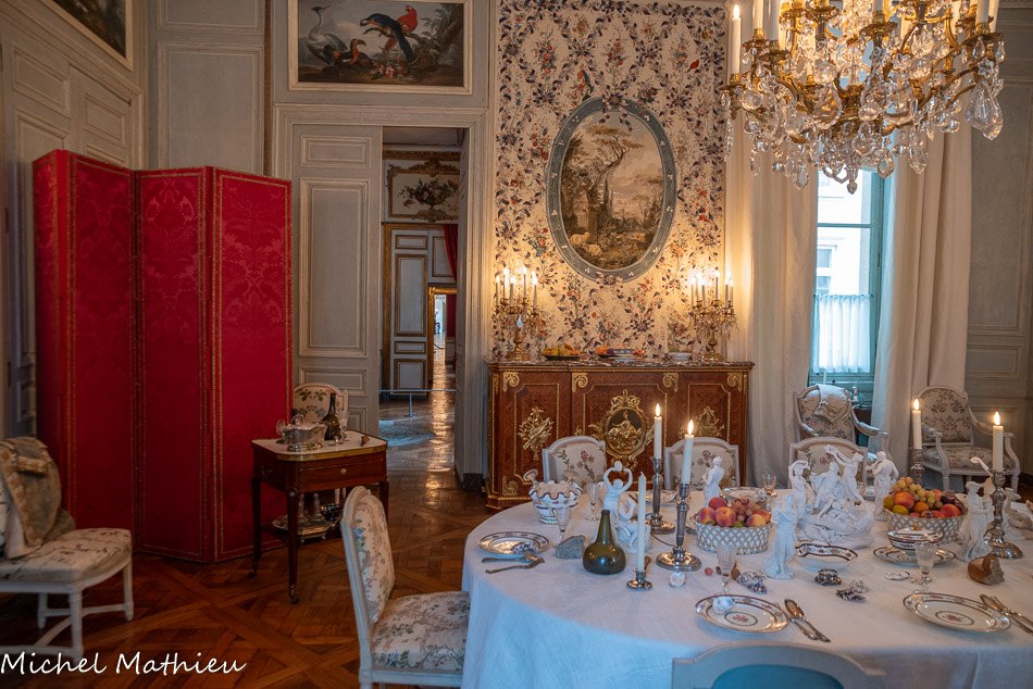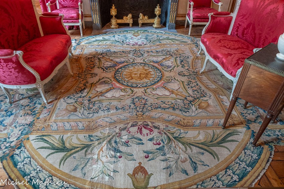 Pendule en porcelaine bleue en forme de lyre. Au centre de la lyre, le cadran émaillé est constitué des douze signes du zodiaque. Le mécanisme est doté de quatre aiguilles, les deux premières indiquant les heures et les secondes, les deux autres, qui manquent, indiquaient les jours et les mois. Un soleil rayonnant en bronze doré surmonte la lyre. Des guirlandes de fleurs et de fruits tombent en chutes, et un décor de couronne de lauriers entoure le cadran. Enfin, des rangs de perles ornent le pied.