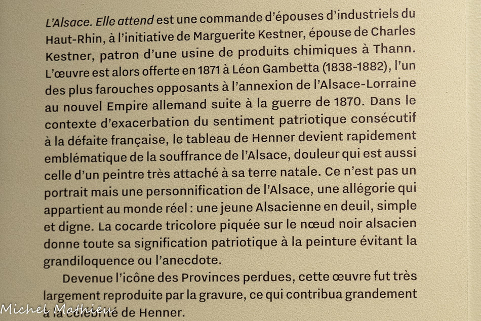 L’Alsace. Elle attend est une commande d’épouses d'industriels de Thann, faite à l’initiative d’Eugénie Kestner. Le tableau est offert à Léon Gambetta (1838-1882) qui est alors un des plus farouches opposants à l’abandon de l’Alsace-Lorraine au nouvel Empire allemand suite à la guerre de 1870. Le tableau de Henner devient rapidement emblématique de la souffrance de l’Alsace, douleur qui est aussi celle d’un peintre très attaché à sa terre natale. Ce n’est pas un portrait mais une personnification de l’Alsace, une allégorie qui appartient au monde réel : une jeune Alsacienne en deuil, simple et digne. À cette époque le peintre adopte un style naturaliste comme en témoigne sa Femme au divan noir exposée au Salon de 1869 (Mulhouse, musée des Beaux-Arts). La cocarde tricolore piquée sur le nœud noir alsacien donne toute sa signification patriotique à une peinture évitant la grandiloquence ou l’anecdote. 1871.